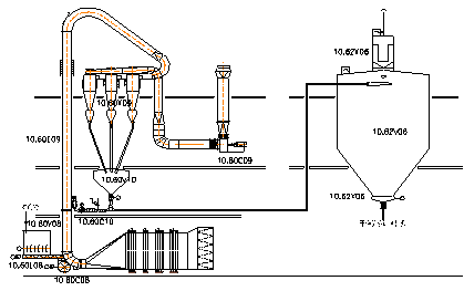 ⑶ 離心風機正壓吹送是稀相輸送,主要是設計好輸送風量、固氣比、風壓、輸送管道直徑、卸料旋風分離器。輸送量為16.67t/h,風速為35m/s,物料密度為0.1%。